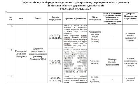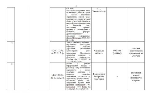 – 25-27 червня – участь у спільній виїзній нараді під головуванням Міністра аграрної політики та продовольства України з керівниками структурних підрозділів обласних державних адміністрацій (Черкаська область). Вартість відрядження – 1 800 грн (добові, проживання), джерело фінансування – в межах кошторисних призначень на 2025 рік;