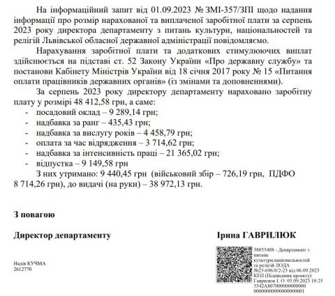 У серпні цього року директорці департаменту з питань культури, національностей та релігій Львівської ОВА Ірині Гаврилюк нарахували 48 412,58 грн заробітної плати. Зокрема, у суму зарплати увійшли такі виплати:
