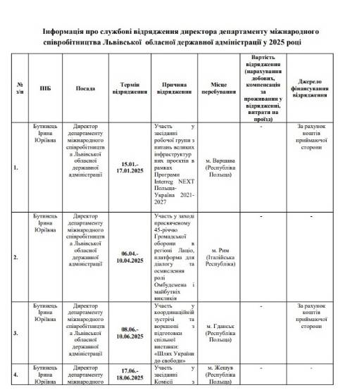 Всього на проїзд та проживання чиновниці під час цих відряджень з бюджету Львівщини не виділили жодних коштів.