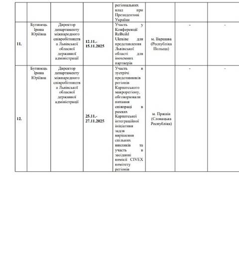 – 12-15 листопада – участь у Конференції ReBuild Ukraine для представлення Львівської області для іноземних партнерів (м. Варшава, Польща). Вартість відрядження – 0 грн;