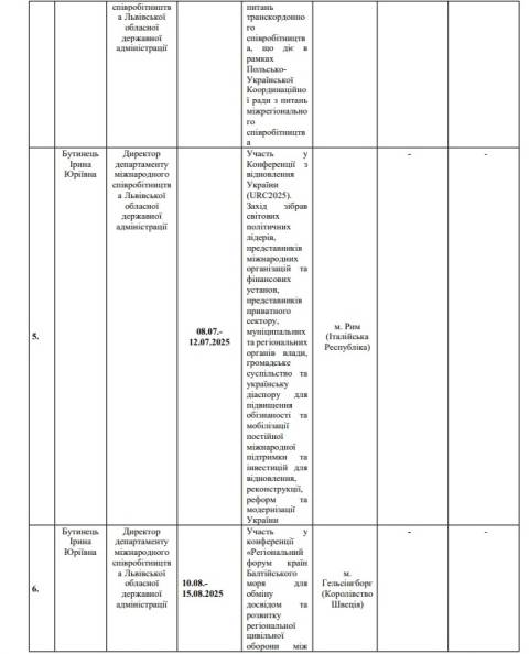 – 8-12 липня – участь у Конференції з відновлення України URC2025 (м. Рим, Італія). Вартість відрядження – 0 грн;