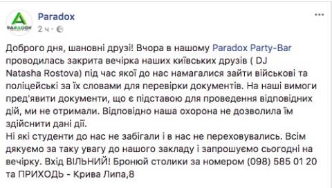 "Вчора у нашому клубі проводилась закрита вечірка київських друзів, під час якої до нас намагалися зайти військові та поліцейські – за їх словами, для перевірки документів. На наші вимоги пред'явити документи, які є підставою для проведення відповідних дій, ми не отримали", – йдеться у повідомленні.