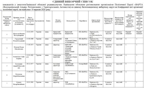 Єдиний виборчий список кандидатів у депутати обласної ради, висунутих Львівською обласною організацією політичної партії "Варта" (Всеукраїнський Альянс Регіональних і Територіальних Активістів):