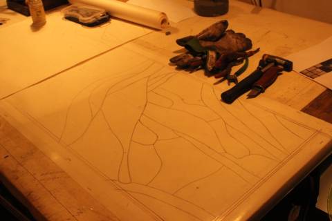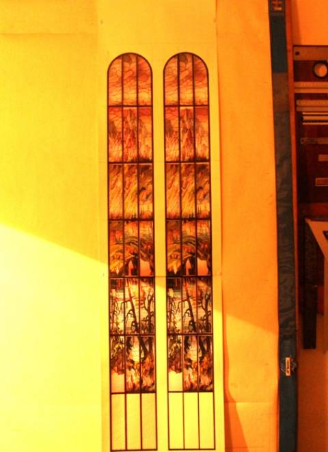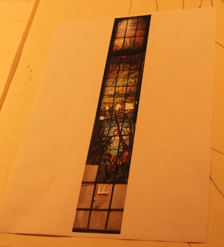 Ось цей проект вітражу показує, як вітражні блоки будуть виглядати після відновлення. Червоним закреслено, ті, які втрачено.