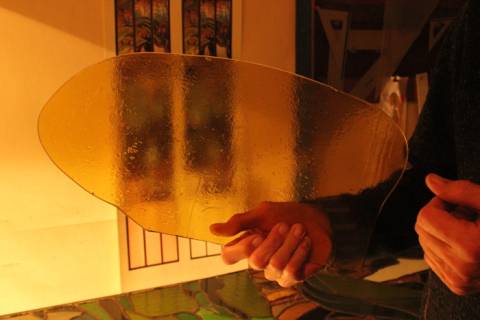 Але можемо замінити відсутні елементи і таким сучасним склом, яке за якостями наближається до старого. Ось, приміром, як ми називаємо, правдиве скло, або катане скло.