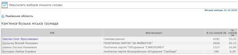 Зокрема, перемогу на виборах голови Кам’янка-Бузької ОТГ здобув чинний міський голова Олег Омелян, який йшов на вибори як самовисуванець. За нього проголосували 53,05% виборців, що становить 4181 голосів.