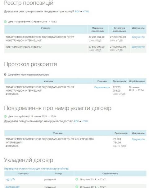 Аукціон стартував 7 червня, участь у ньому взяли дві компанії: ТзОВ "Онур" та ТОВ "Автомагістраль-Південь", які запропонували здійснити усі роботи за 27 203 784 грн та 27 600 000 грн відповідно. Переможцем обрали ТзОВ "Онур". Додамо, очікувана вартість послуг становила 27 800 474 грн.