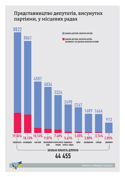 Зазначимо, станом на 11 листопада, за кількістю обраних депутатів за результатами виборів до місцевих рад, що подолали 5% бар’єр, лідирують Блок Петра Порошенка "Солідарність", ВО "Батьківщина" і "Наш край".