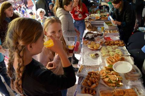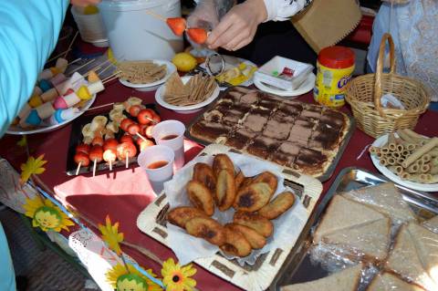 Ой леле! Тут дійсно було від чого задурманіти. Чого тільки душа могла забажати, те можна було за незначну плату придбати. Наважуся перелічити бодай деякі зі смаколиків: торти, пироги-пляцки, пиріжки, пампушки, кошички, трубочки, рулети, тістечка, хрусти, пирожні, канапки, домашня піца. Це – зі сфери кулінарно-кондитерського вищого пілотажу.