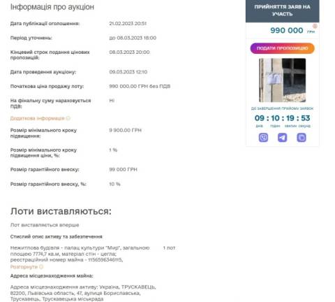 Аукціон відбудеться 9 березня. Будівлю уже виставляли на продаж у 2021 році, тоді стартова ціна була 31,8 млн грн.