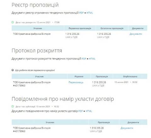Аукціон стартував 13 липня, участь у ньому взяла лише одна компанія – ТОВ "Креативна фабрика "Вікторія", що запропонувала відреставрувати пам'ятник за 1 316 205,26 грн. Її й оголисили переможцем торгів.