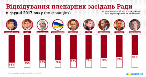 У середньому на сесіях Верховної Ради було зареєстровано 85% депутатів Народного фронту (69 нардепів), 83% – Блоку Петра Порошенка (114), 78% – ВО «Батьківщина» (15), 76% – позафракційних (38), 75% – «Самопомочі» (18), 72% – Радикальної партії Олега Ляшка (15), 70% – «Відродження» (18), 69% – «Опозиційного блоку» (29), 61% – «Волі Народу» (10).