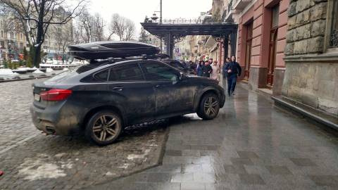 Сьогодні активісти опублікували фото, на якому позашляховик та ще мінімум один автомобіль, що припарковані біля входу в "Гранд Готель" на проспекті Свободи, перекрили рух половиною тротуару.