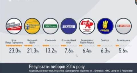 Згідно з результатами, Блок Петра Порошенка набирає 23,0% голосів, Народний фронт - 21,3%, Самопоміч - 13,2%, Опозиційний блок - 7,7%, Радикальна партія Ляшка - 6,4%, Свобода - 6,3%, Батьківщина - 5,6%, Інші партії не долають 5-відсоткового бар'єру.