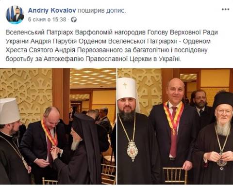 "Вселенський Патріарх Варфоломій нагородив Голову Верховної Ради України Андрія Парубія Орденом Вселенської Патріархії - Орденом Хреста Святого Андрія Первозванного за багатолітню і послідовну боротьбу за Автокефалію Православної Церкви в Україні" – зазначив Коваль.