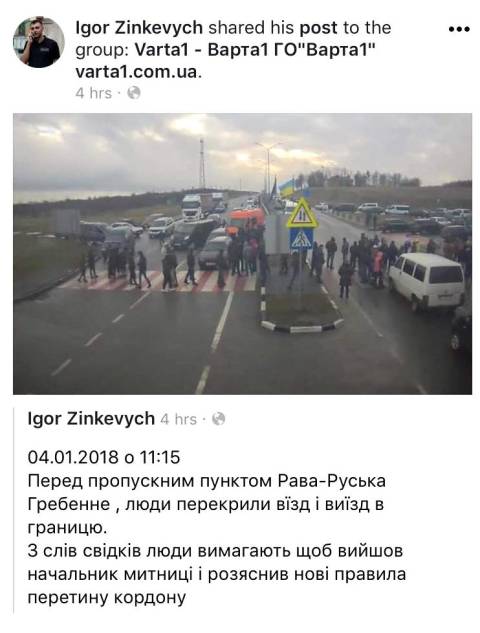 Як повідомив депутат Львівської міської ради Ігор Зінкевич у спільноті "Варта 1", сьогодні, близько 11:00 год. перед пунктом пропуску Рава-Руська–Гребенне громадяни перекрили в'їзд і виїзд.