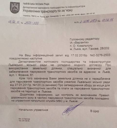 Варіанти звернулися з офіційним запитом до Львівської міськради і отримали відповідь, що департамент житлового господарства та інфраструктури не укладав жодного договору на облаштування парковки.