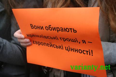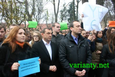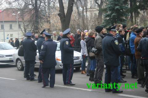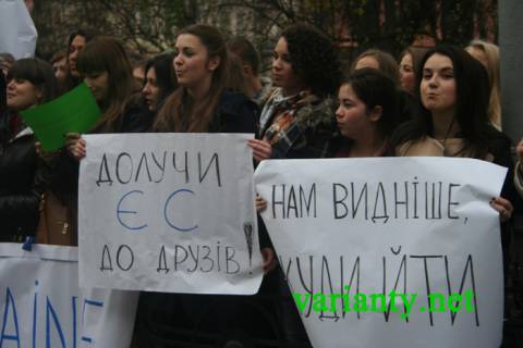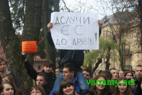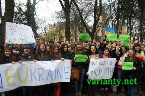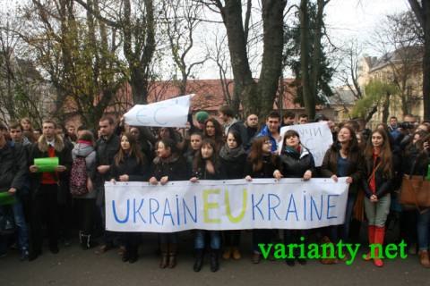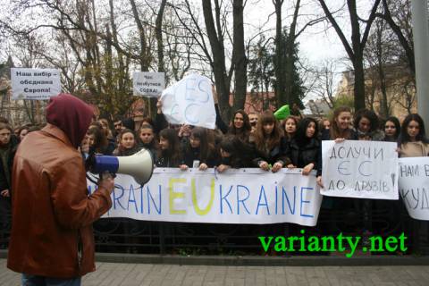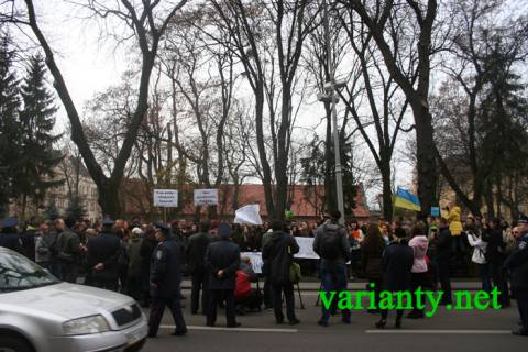 Сьогодні, о 11 годині біля стін Львівської обласної ради, з протестом проти провалу євроінтеграції України зібралося близько стоні людей.