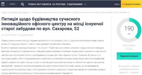 За чотири дні петиція про збереження будинку на Сахарова, 52 та недопустимість будівництва тут офісного центру зібрала 512 голосів.