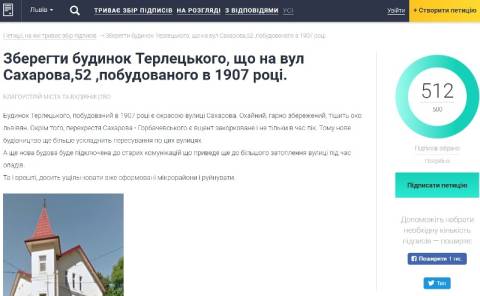 Як повідомляли Варіанти раніше, 26 липня на порталі е-петицій Лідія Конюх зареєструвала електронну петицію з вимогою зберегти будинок Терлецького, побудований в 1907 році на вул Сахарова, 52.