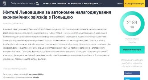 Наразі петиція зібрала 2184 голосів, її подали у листопаді 2016 року, а йдеться у ній про автономне налагоджування економічних зв'язків з Львівщини з Польщею в обхід центральної влади України.