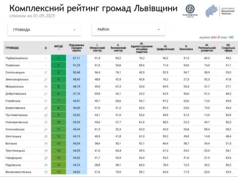 У Львівській ОВА підготували комплексний рейтинг територіальних громад, починаючи з початку року і станом на 1 вересня, який очолила Підберізцівська громада.