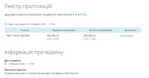 Аукціон мав стартувати 17 березня, однак його скасували через те, що для участі у торгах необхідно дві пропозиції, а на них подалася лише одна фірма. Додамо, що початкова закупівлі становила 490 000 грн.