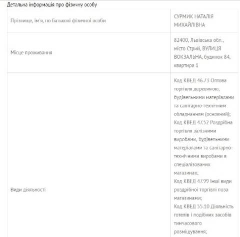 За даними Єдиного державного реєстру юридичних осіб, фізичних осіб-підприємців та громадських формувань, Сурмик займається оптовою торгівлем деревиною та будівельними матеріалами. Вона зареєструвалася як фізична-особа – підприємець у 2011 році у Стрию.