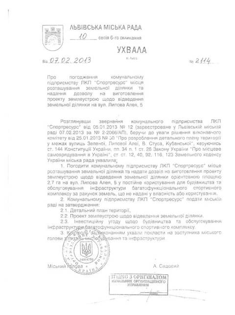Своєю ухвалою від 7 лютого 2013 року Львівська міськрада погодила комунальному підприємству ЛКП "Спортресурс" місце розташування земельної ділянки та надала дозвіл на виготовлення проекту землеустрою щодо відведення земельної ділянки на вул. Липова Алея, 5.