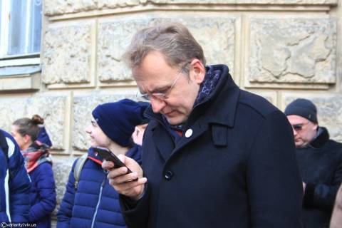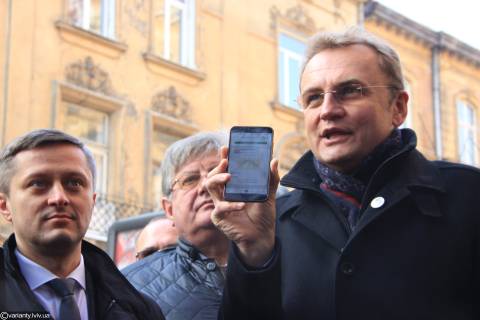 Найпопулярніша постать української планети на цю мить, міський голова Львова Андрій Садовий у шалику Гуччі, майже урочисто презентує безготівкову оплату проїзду через мобільний додаток "Приват24" у сихівському трамваї.