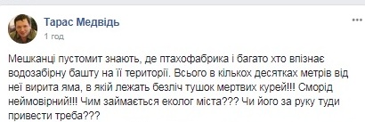 "Мешканці Пустомит знають, де птахофабрика і багато хто впізнає водозабірну башту на її території. Всього в кількох десятках метрів від неї вирита яма, в якій лежать безліч тушок мертвих курей", – йдеться у повідомленні.
