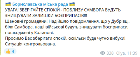 "Надійшло повідомлення, що у Дубрівці, біля Самбора, наші військові будуть знищувати боєприпаси, пошкоджені у Калинові. Просимо Вас зберігати спокій, оскільки буде чутно вибухи! Ситуація контрольована" – йдеться у повідомленні.