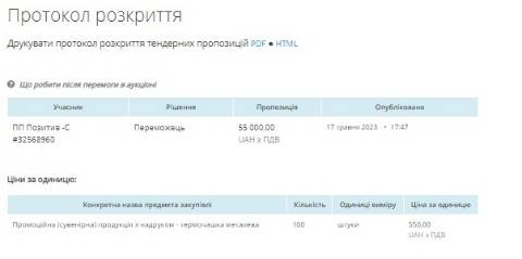 - 100 штук металевих термочашок загальною вартістю 55 000 грн (вартість однієї термочашки – 550 грн);