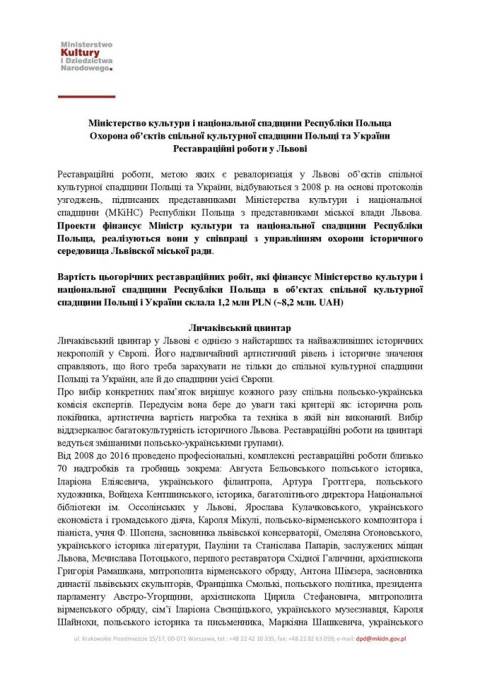 Міністерство культури і національної спадщини Республіки Польща в межах охорони об'єктів спільної культурної спадщини Польщі та України реставровуватиме у Львові пам'ятки культури.