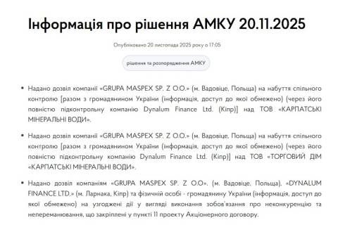 "Надано дозвіл компанії Grupa Maspex sp. z o.o. (м. Вадовіце, Польща) на набуття спільного контролю разом з громадянином України (через його повністю підконтрольну компанію Dynalum Finance Ltd. (Кіпр) над ТОВ "Карпатській мінеральні води".