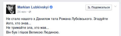 Про це повідомив у своєму ФБ його син Маркіян Лубківський.