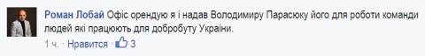 У соцмережі Facebook Роман Лобай заявив, що особисто він винаймає це приміщення, але віддав його у користування Парасюку.