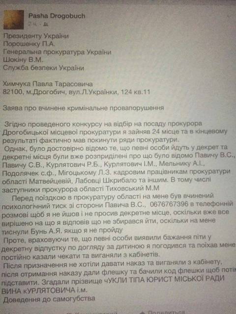 Круглов також повідомив інші деталі: "Павло Хімчук не проходив по рейтингу на посаду у мiсцеву прокуратуру, але коли з'явилася можливiсть пройти на декретне мiсце, виявилось, що це мiсце вже "належить" бiльш "достойному" працiвнику. Перед самогубством він написав передсмертну записку, та залишив повідомлення в ФБ (хтось вже видалив https://www.facebook.com/pasha.drogobuch).