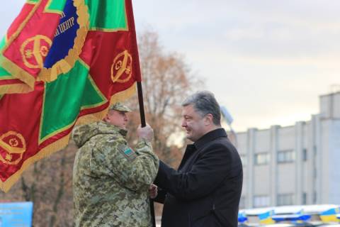 Петро Порошенко вручив бойові прапори Львівському, Мостиському прикордонним загонам та Кінологічному навчальному центру, а також вручив ордени за мужність 3-го ступеню прикордонникам, які брали участь у бойових діях на сході України.