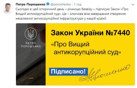 "Сьогодні в цей історичний день – річницю безвізу – підписую Закон "Про Вищий антикорупційний суд". Це – ключова віха завершення створення незалежної антикорупційної інфраструктури у нашій країні", – заявив Порошенко.