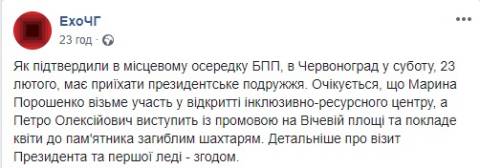 У Червоноградському осередку Блоку Петра Порошенка підтвердили, що в суботу, 23 лютого, до міста приїде президент України Петро Порошенко зі своєю дружиною Мариною Порошенко.