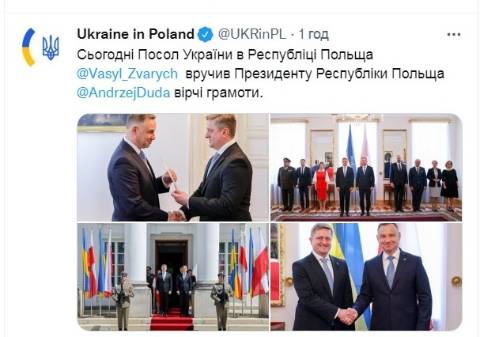 "Сьогодні Посол України в Республіці Польща Василь Зварич вручив Президенту Республіки Польща Анджею Дуді вірчі грамоти" – йдеться у повідомленні.