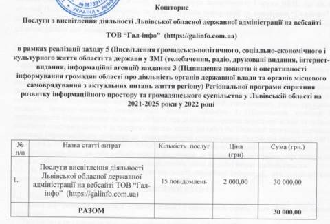- 15 послуг (по 2 000 грн кожна) з висвітлення діяльності на сайті "Гал-Інфо" загальною вартістю 30 000 грн у ТзОВ "Агенція інформації та аналітики "Гал-Інфо".