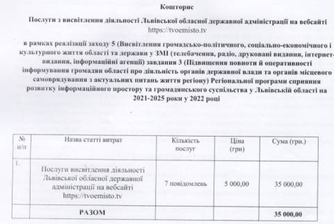 - 21 послуга (по 1 000 грн кожна) з висвітлення діяльності на сайті "Львівський портал" загальною вартістю 21 000 грн у ПП "Інформаційне агентство "Львівський портал";