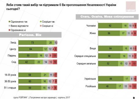 Найбільше українців, які підтримують проголошення Незалежності України, є на Заході (93%). У Центрі таких опитаних 76%, на Півдні – 66%, на Сході – 64%.