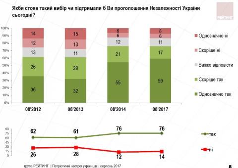 Згідно з результатами дослідження, проведеного Соціологічною групою "Рейтинг" 2-13 серпня цього року, 76% опитаних підтримали проголошення Незалежності України, якщо б сьогодні стояв цей вибір.