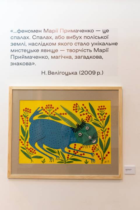 "Особливо зараз, під час війни, творчість Марії Примаченко є важливим складником культурного фронту. Її щире та геніальне мистецтво, глибоко вкорінене у землю народу, знову проростає новими сенсами. Різнобарвне малярство мисткині порушує близькі сьогоденню теми", – пояснює завідувачка відділу народного мистецтва НМЛ Любава Собуцька.