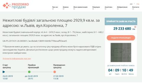 Управління майном спільної власності Львівської обласної ради виставило на продаж у системі Pro Zorro за 29 233 680 грн нежитлові будівлі загальною площею 2929,9 кв.м на вул. В.Короленка, 7 у Львові.