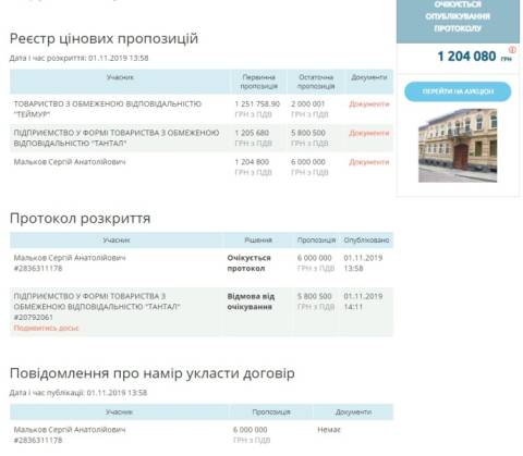 Відтак, повторний аукціон стартував 1 листопада, участь у ньому взяли ТзОВ "Теймур", ТзОВ "Тантал" та Сергій Мальков, які запропонували за приміщення 2 000 001 грн, 5 800 500 грн й 6 000 000 грн відповідно. Перемлжцем обрали Сергія Малькова.
