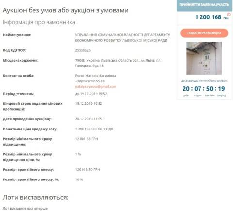 Аукціон стартує 20 грудня, а початкова вартість приміщення становить 1 200 168 грн.